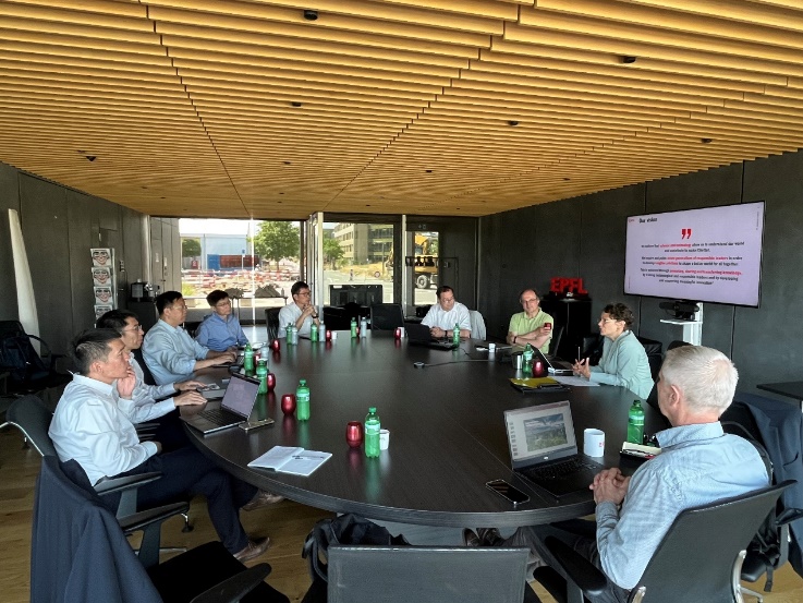 7月6日,曾嵘一行访问苏黎世联邦理工学院,与分管科研副校长克里斯丁·沃尔夫鲁姆(Christian Wolfrum)等会面交流。沃尔夫鲁姆介绍了学校的整体情况,重点分享了学校如何推动基础研究和应用研究均衡发展,以及学校在人才引进和科研环境建设等方面的经验。曾嵘一行对苏黎世联邦理工学院近年来取得的成绩表示祝贺,围绕学院的科研经费构成、学科交叉科研的组织形式、人才引进的决策程序、技术转移收益分配机制等进行座谈交流,并参观了该校在地热与固碳综合应用、航空排放测算与控制、医疗辅助机器人等方向的实验室。