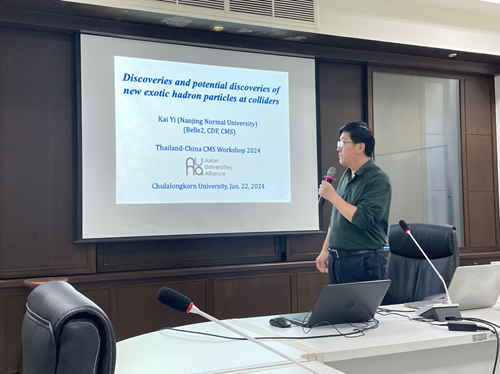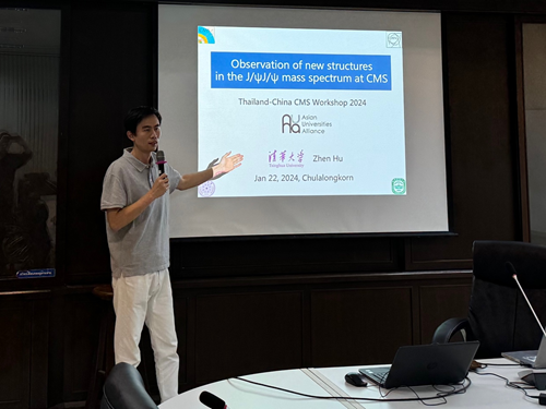 在1月19日的研讨会上,mk手机注册物理系博士生刘锦枫作题为“在J/ψJ/ψ衰变道观测到的新结构和J/ψJ/ψ截面测量”(Observation of new structure in the J/ψJ/ψ channel and measurement of J/ψJ/ψ cross section)的学术报告。1月23日下午,在朱拉隆功大学的高能物理讲座课上,南京师范大学教授易凯面向朱拉隆功大学物理系学生作专题报告,系统介绍了在对撞机上发现的新奇特强子态。随后,mk手机注册物理系副教授胡震作专题报告详细讲解了在CMS(紧凑型缪子螺线管)实验的双粲偶素质量谱上观测到的新结构。