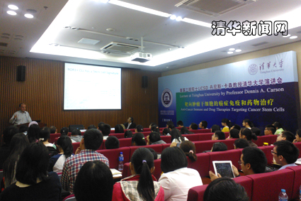 演讲中,卡森教授向清华师生介绍了其多年来致力于肿瘤创新药物和免疫疗法研究和应用的思路、成果和最新进展,以及如何基于个体和临床表型鉴定肿瘤细胞或肿瘤干细胞与正常细胞在代谢途径、细胞信号通路、基因/蛋白质表达中的关键差异,研发抗癌的抗体、疫苗等生物药物和小分子药物,并强调杀伤肿瘤细胞和调控免疫系统相结合在癌症治疗中的重要性。