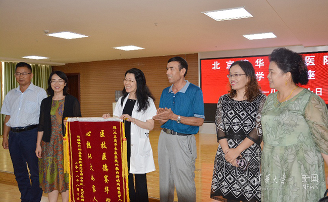 其中,心脏内科主任医师刘芳在该院进行了“高血压患者管理策略”的主题学术讲座,结束后,她正要到楼下加入义诊的队伍中,却被一家人拦了下来。刘医师一脸茫然。三人中的男子拿出锦旗献给她,并面向台下用维语如高声朗诵般说着什么,当地的维族医生后来解释,他是一名心脏病患者,在感谢北京清华长庚医院心脏内科的团队诊疗。