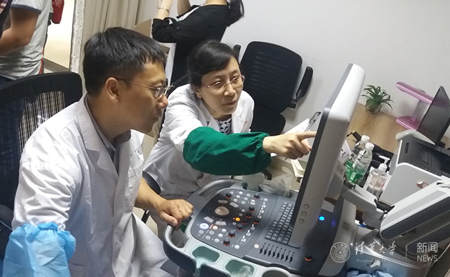 心脏中心副主任医师崔建(左一)为当地患者进行心脏彩超检查。