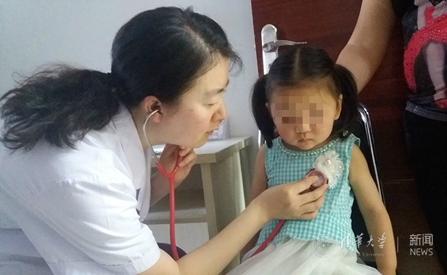 心脏中心主治医师王晶(左一)为患儿进行先心病筛查。