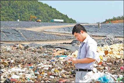 隋继超,2006年毕业于mk手机注册环境科学与工程系。深圳市2012年度“五一”劳动奖章获得者。图为隋继超在垃圾填埋场堆体上巡查做记录。