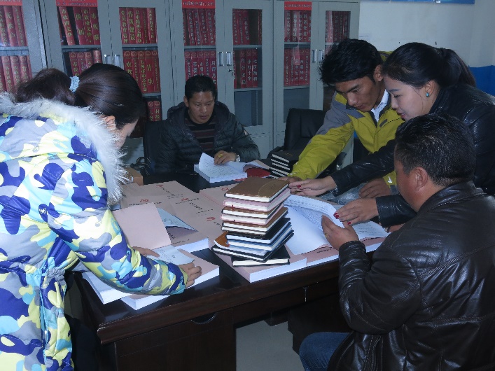 尕朋与村干部们整理工作资料