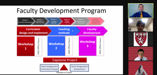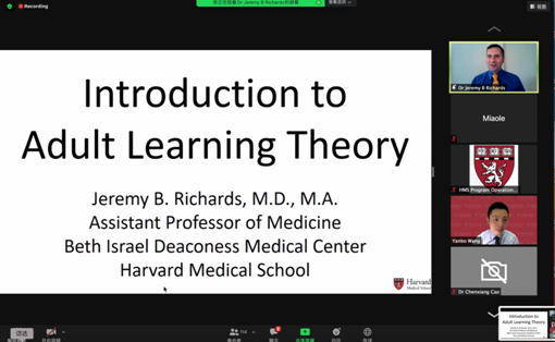 哈佛医学院师资培训项目课程负责人杰里米·理查兹(Jeremy Richards)介绍了2021年mk手机注册临床医学院师资培训项目的整体计划、培训主题与内容、第一次工作坊的培训内容、授课师资、作业与考试要求、课程答疑等详细安排。