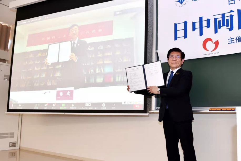 铃木将史宣读了国际创价学会会长、日本创价学会名誉会长、创价大学创办人池田大作的贺信,信中表达了对于两校合作促进中日友好关系发展的深切期望。铃木将史在致辞中表示,创价大学将积极推进两校交流,深化教育科研合作,为日中两国友好交流贡献力量。