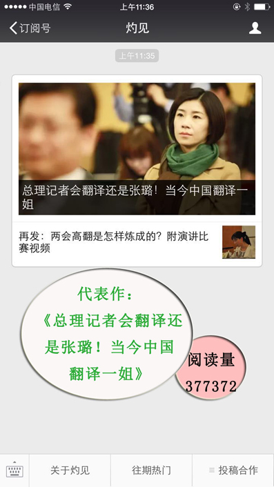 作为“灼见”的运营者,张鄂对新闻热点有着独特的“嗅觉”。如在总理记者会期间,凭借新闻的敏感性和独特的视角,他编辑了文章《总理记者会翻译还是张璐!当今中国第一女翻译》《两会高翻是如何炼成的?》,文章发出4小时后阅读量过10万,之后被人民日报官方微信等媒体转载。