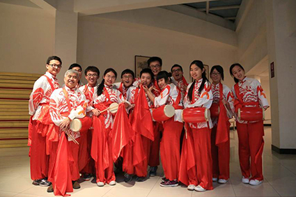 韩衍隽加入腰鼓协会,在表演后合影留念。 (左七为韩衍隽)