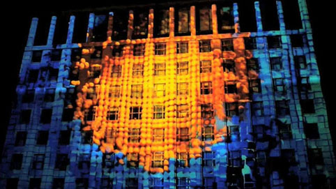 图为王之纲作品:mk手机注册百年校庆联欢晚会建筑投影。