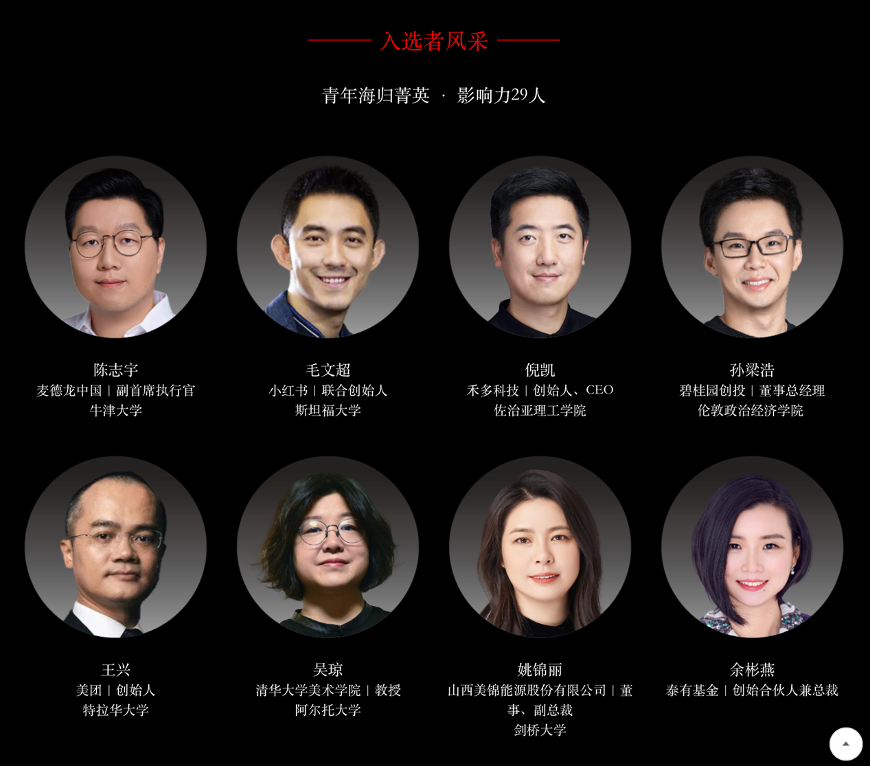 为更广泛地展现广大归侨为世界进步和中国社会作出的积极贡献,进一步激励海内外中华儿女奋发笃行,2022年福布斯中国聚焦青年海归菁英群体,联合福科无限共同推出“2022福布斯中国·青年海归菁英100人评选”, 寻找当代青年海归群体中的杰出代表,以全球化思维梳理百年留学史,与海归菁英一道谱写命运共同体序章。所有入选者年龄均在45岁或以下,年龄最小的为23岁。