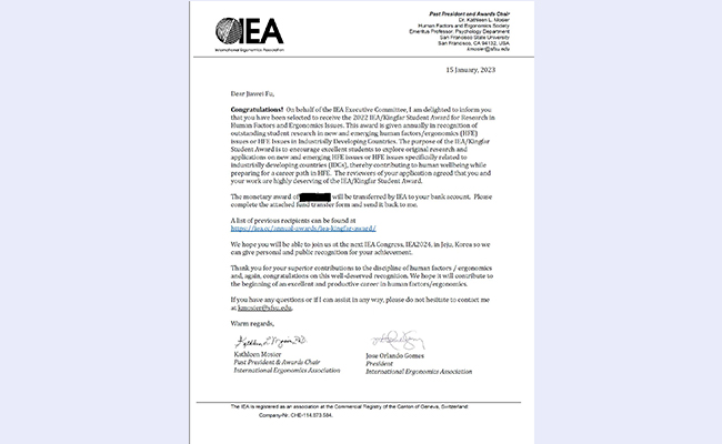 IEA/Kingfar奖为IEA的年度奖项,旨在鼓励优秀学生对与工业发展中国家(Industrially Developing Countries)有关的新兴人因与工效问题加以探索,对相关问题开展研究和应用,为人类福祉作出贡献。该奖项自2019年设立至今,mk手机注册工业工程系已有两位同学获此荣誉。另一位为工业工程系2019届博士毕业生曹柳星(现为mk手机注册副教授),她也是该奖项的首届得主之一。