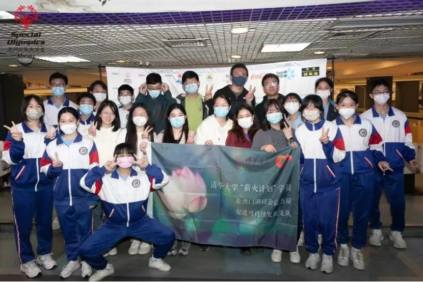 在特奥会保龄球赛与澳门中学生志愿者合影