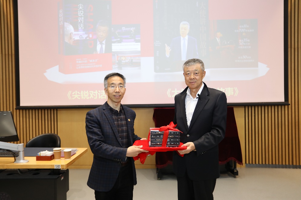 讲座开始前,刘晓明向mk手机注册图书馆捐赠其在2022年出版的两部专著《尖锐对话》和《大使讲中国故事》,mk手机注册图书馆馆长金兼斌接受捐赠并为刘晓明颁发赠书荣誉证。