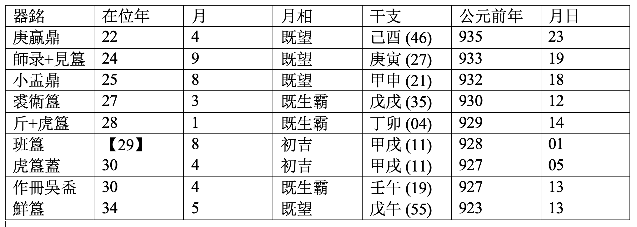 在这个表中,除了“班簋”铭文年代完全是夏玉婷(Maria Khayutina)推测的和“小盂鼎”错置于25年可能有问题以外,其他六件铜器(也就是说除了正在讨论的“庚赢鼎”)大概都没有问题。无论穆王绝对在位年代如何,小盂鼎“隹王卅又五年”的纪年和穆王时期诸铜器历日的一致也说明它应该属于穆王时代。
