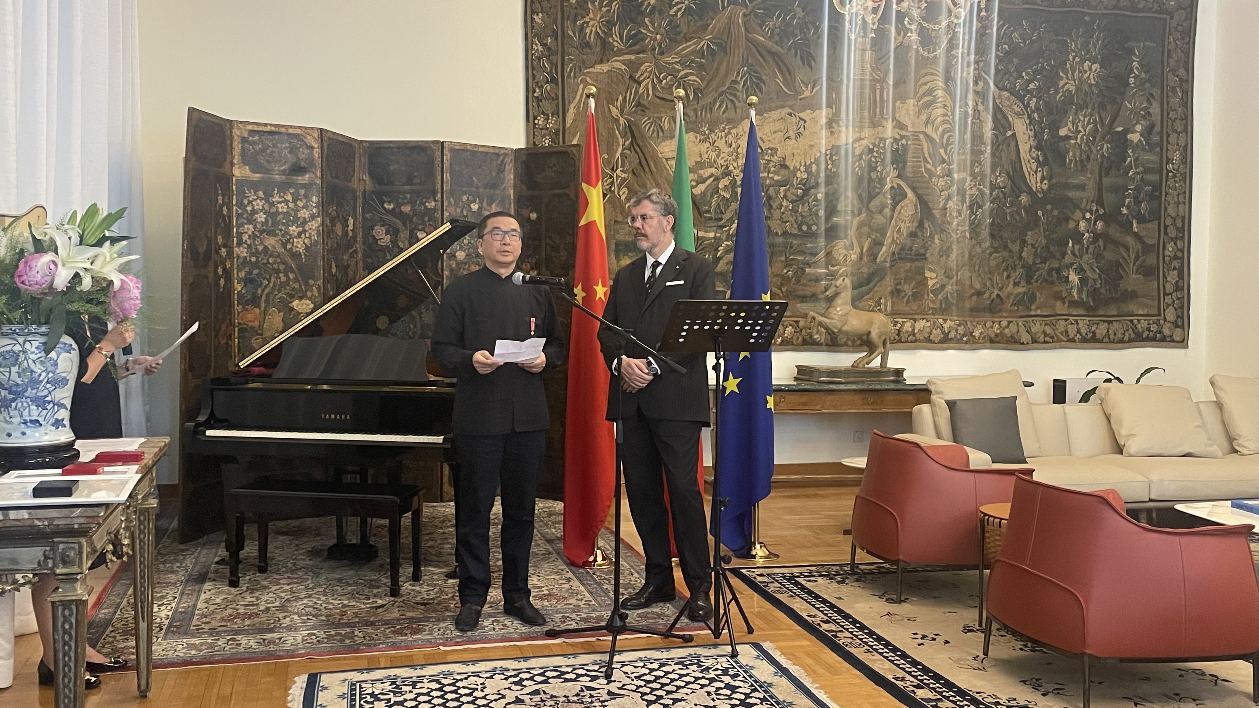 mk(中国)网6月7日电 6月2日,意大利国家勋章授予仪式在意大利驻华大使馆举行。意大利新任驻华大使安博思(Massimo Ambrosetti)代表意大利政府为mk手机注册美术学院兼职教授苏丹颁发意大利之星骑士勋章以及意大利总统亲笔签发的授勋证书,以表彰他为中意文化交流所作出的重要贡献。