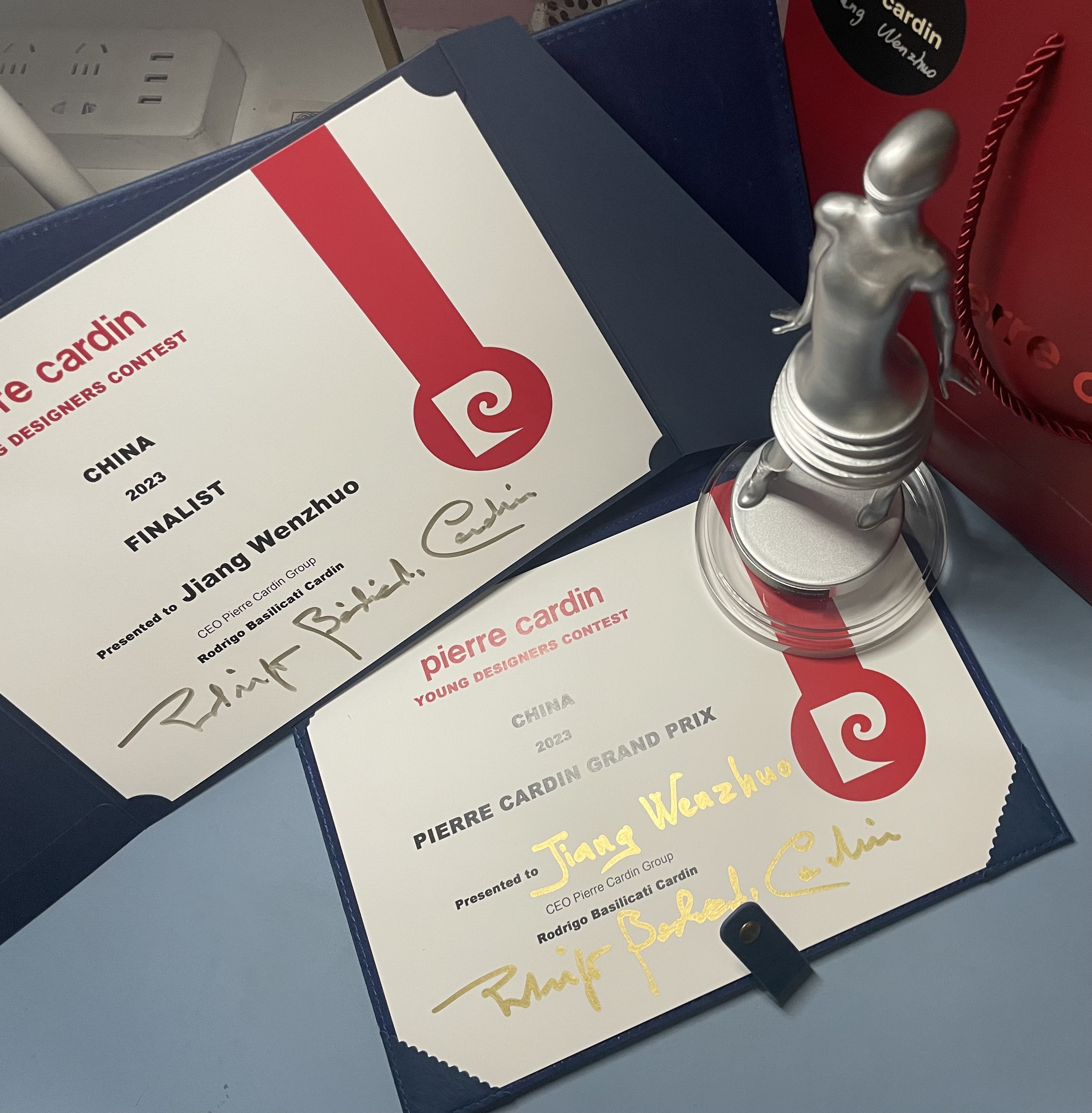 本次大赛共收到500余份参赛作品,涉及50余所院校,由皮尔·卡丹巴黎工作室独立评选出半决赛作品,总裁罗德里戈·卡丹(Rodrigo Basilicati Cardin)率一线设计师来到中国,选拔进入决赛的作品,最终江文卓的作品立足中国传统民族服饰文化、结合皮尔·卡丹品牌元素以及可持续发展理念,从决赛作品中脱颖而出,获得评委高度评价。