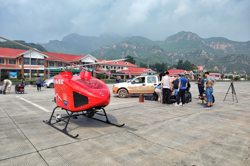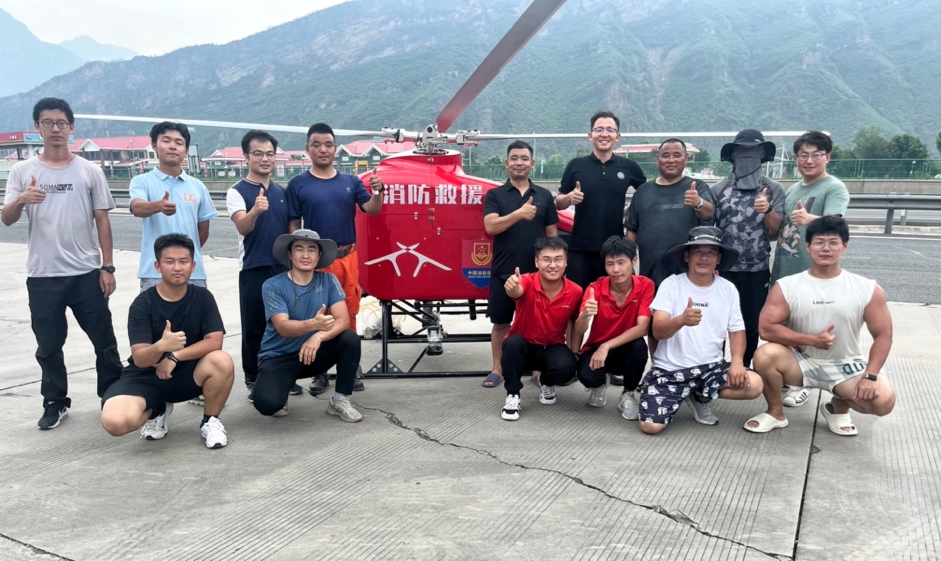 8月2日,“清航装备”团队接到涞水县受灾区物资投放任务后,第一时间启动紧急救援任务预案,快速成立了一支13人的无人机分队,部署一架JZ-550型号无人直升机前往灾区执行救援任务。3日上午9时,挂载救援物资的JZ-550交叉双旋翼无人直升机从野三坡服务区起飞,克服山区恶劣环境,快速飞向涞水县受灾点,抵达目标区域上空后,无人机通过绳索连续精准地进行食品、药品、饮用水、汽油和发电机等救援物资的空中投送,持续作业8小时,9进9出累计为已被困4天的村落投放物资近500公斤,有效解决了被困200余人的急需物资与生活保障。