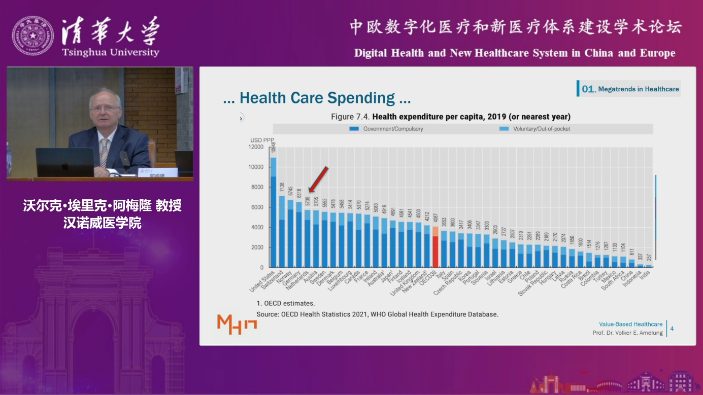 主题分享环节,德国汉诺威医学院教授、德国联邦管理式医疗协会(BMC)董事会主席沃尔克·埃里克·阿梅隆(Völker Eric Amelung)介绍了欧洲各国医疗评价体系和医院发展趋势,并以德国和丹麦为例,重点介绍了数字化医疗在创新医疗保健中发挥的重要作用。
