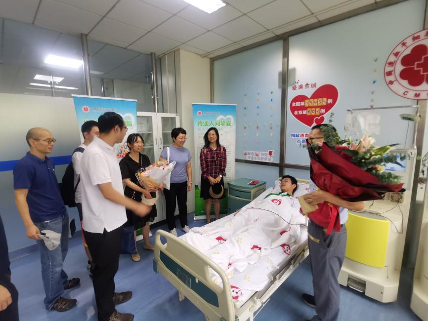 夏阳亲切慰问了巩师远,并在捐赠现场为巩师远颁发了捐献造血干细胞荣誉证书。瞿福平对巩师远的爱心捐赠表示衷心的感谢,并代表清华园街道为巩师远赠送慰问品。郭增才、王大亮等代表学院询问了解了巩师远造血干细胞的捐献过程,关心了巩师远在住院期间的情况,并反复叮嘱巩师远注意饮食和休息。