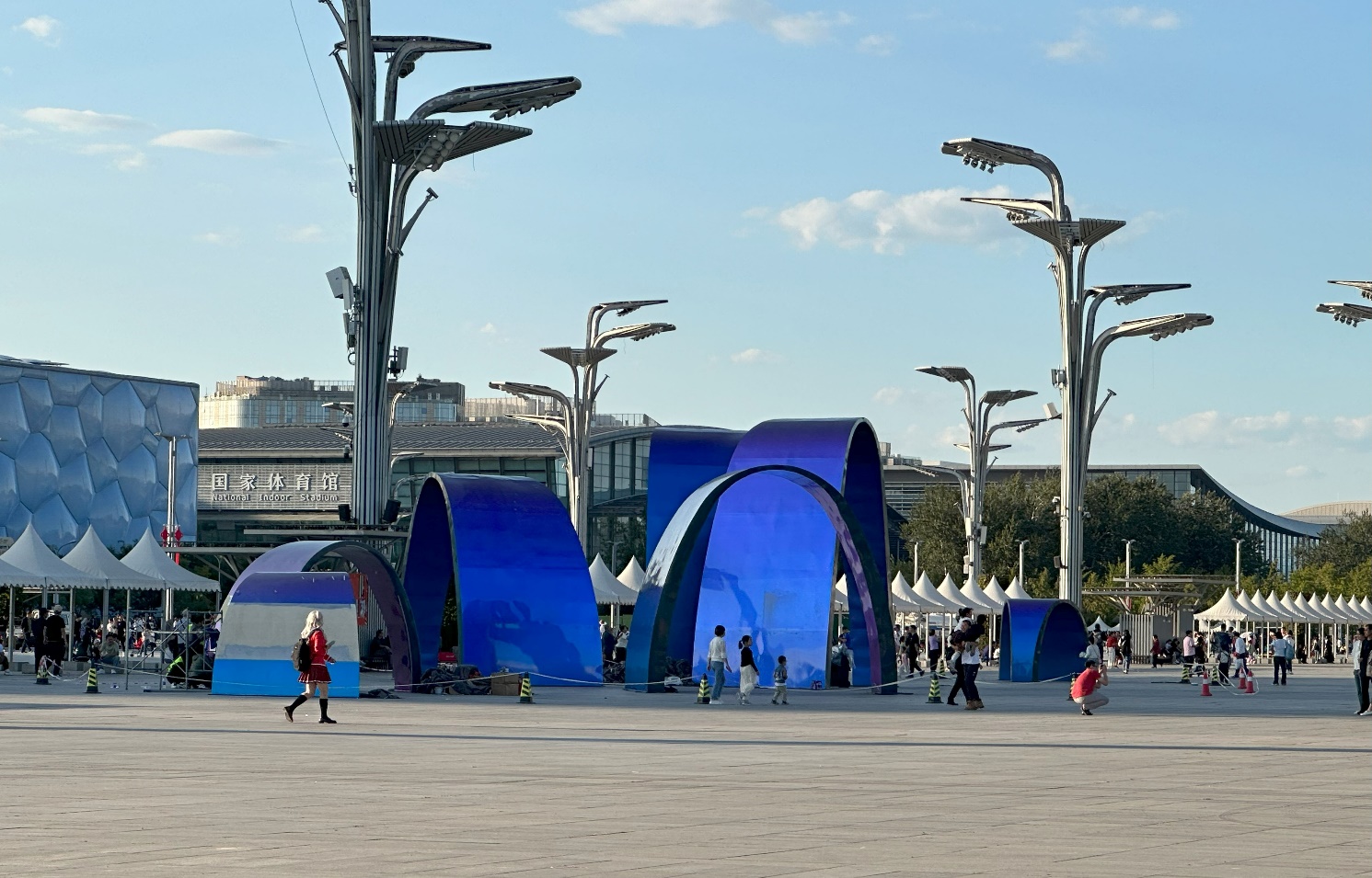 如花朝阳硬质景观坐落在鸟巢西南侧广场,由7个单体钢质锦带造型组成