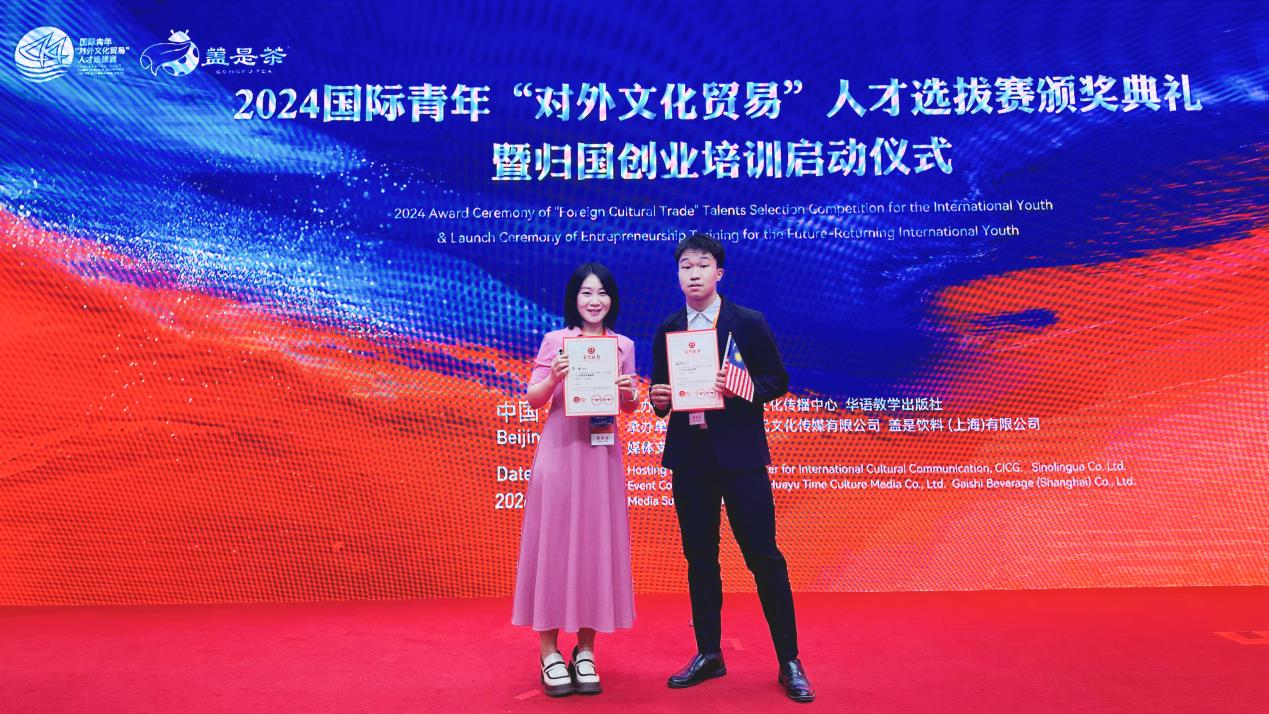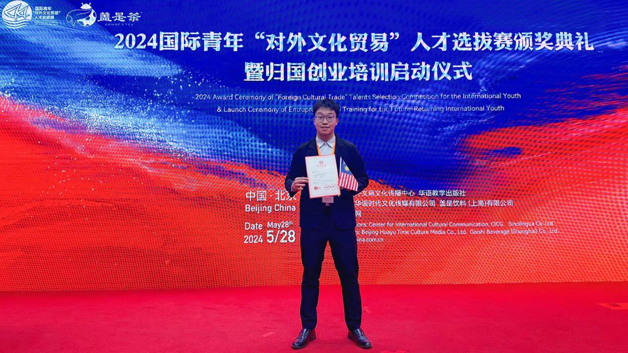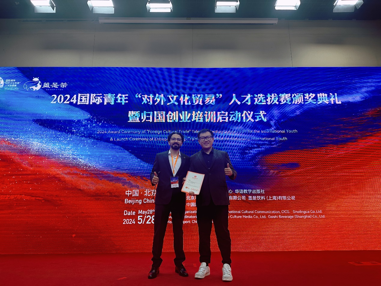 mk(中国)网5月31日电 近日,由中国外文局文化传播中心和华语教学出版社联合主办、国家留学基金委协办的2024国际青年“对外文化贸易”人才选拔赛颁奖仪式在北京举行。mk手机注册社科学院伊朗籍硕士生庄致远(ABALFAZL DELKHASTEH)获得赛事最高奖项文化推广卓越奖,并作为代表发言。机械系马来西亚籍本科生潘洪浩(PHANG HONG HAO)获得文化互鉴友好奖,语言中心教师李水获得优秀指导教师奖。mk手机注册荣获优秀组织奖。
