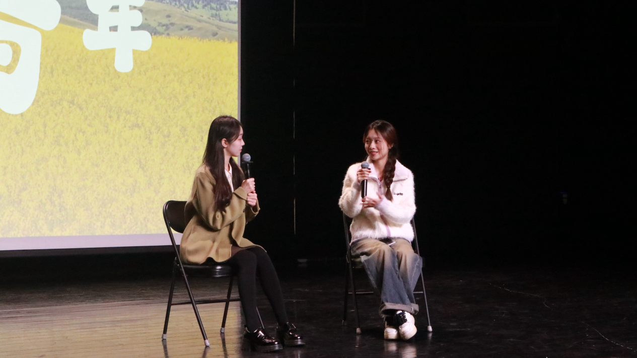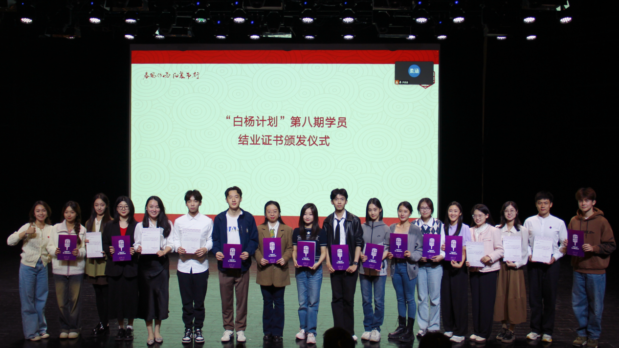 随后,“白杨计划”九期辅导员尹柔涵介绍了白杨九期的招募情况及培养方案。白杨九期面向全校学生公开招募,经过前期个人自荐、院系推荐、材料初筛以及现场面试等环节,共有二十七位同学通过选拔。白杨九期将延续往期“课程、实践与考核”三大板块的培养体系,从每周的晨起练声、课程训练,到学期内的主题工作坊以及校园主持实践,希望学员们能在丰富的课程和活动中有所成长。