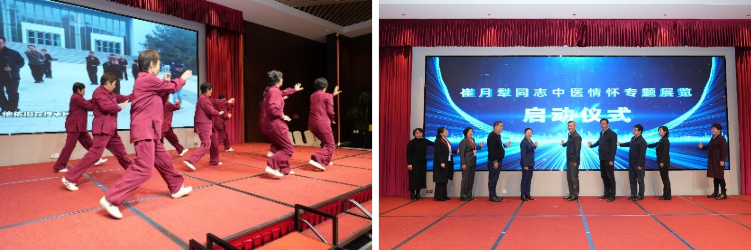 非物质文化遗产形意拳(左)、“崔月犁同志中医情怀专题展览”启动仪式(右)