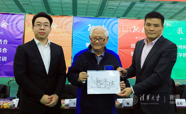前射击队队员、建筑学院教授高冀生分享了自己50年代末参加射击训练的经历及收获,并向射击队赠送了自己创作的“清华二校门”钢笔画。他以自己年已八旬仍然坚持锻炼和工作、为祖国健康工作59年的实际行动鼓励全体队员全面发展。