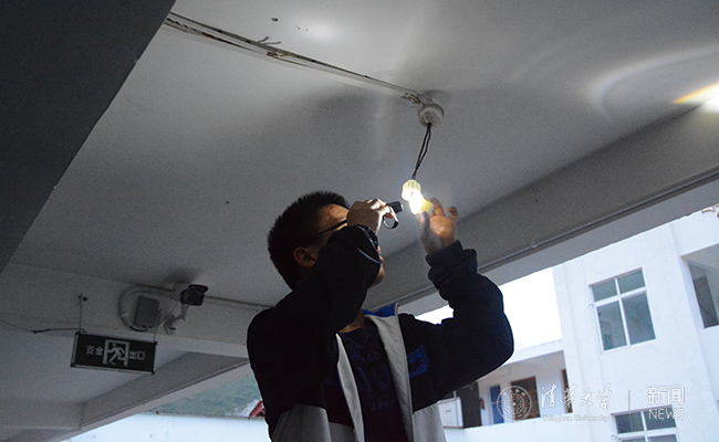 队员为学校更换节能LED灯。 邹琂 摄