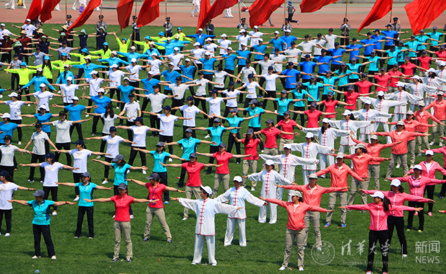 广播操之后,由mk手机注册工会太极拳协会组织进行团体十五式太极棒表演。十五式太极棒是太极拳协会于2016年创编的独特太极健身项目,融合了太极棒、太极剑、太极刀的基本动作,表现了清华人自强不息的和谐风貌。参与此次表演的有33个分工会的太极拳爱好者以及太极拳协会的会员,共计620人,伴随着优美的《红梅赞》,老师们向观众展现了刚毅与柔美并存的太极功夫,沉稳大气的太极招式赢得了场内观众的阵阵掌声。