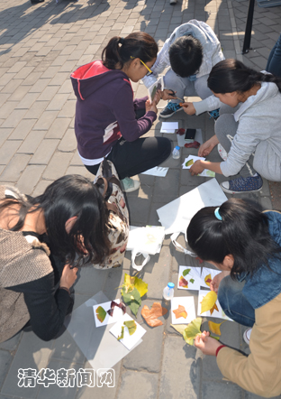 嘉年华活动现场,“叶画叶拓”是人气最高的游戏项目,不仅摊位前帐挤满了参与者,就连周围的花坛边和小桌子上也伏满了创作的“艺术家”们。制作树叶书签的人将事先收集好的落叶剪裁,拼贴覆盖在书签的底板上,然后塑封起来长久保存纪念。“叶画叶拓”的工作人员马骁介绍说,摊点来的人比预期多出很多,同学们的参与热情特别高,“制作书签的塑封机都忙得一度进入了罢工状态”。