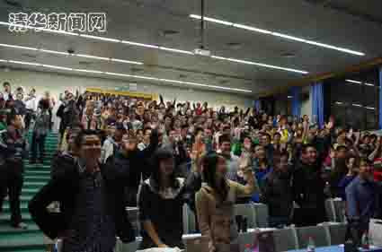 图为游戏环节中全场同学踊跃举手回答问题。