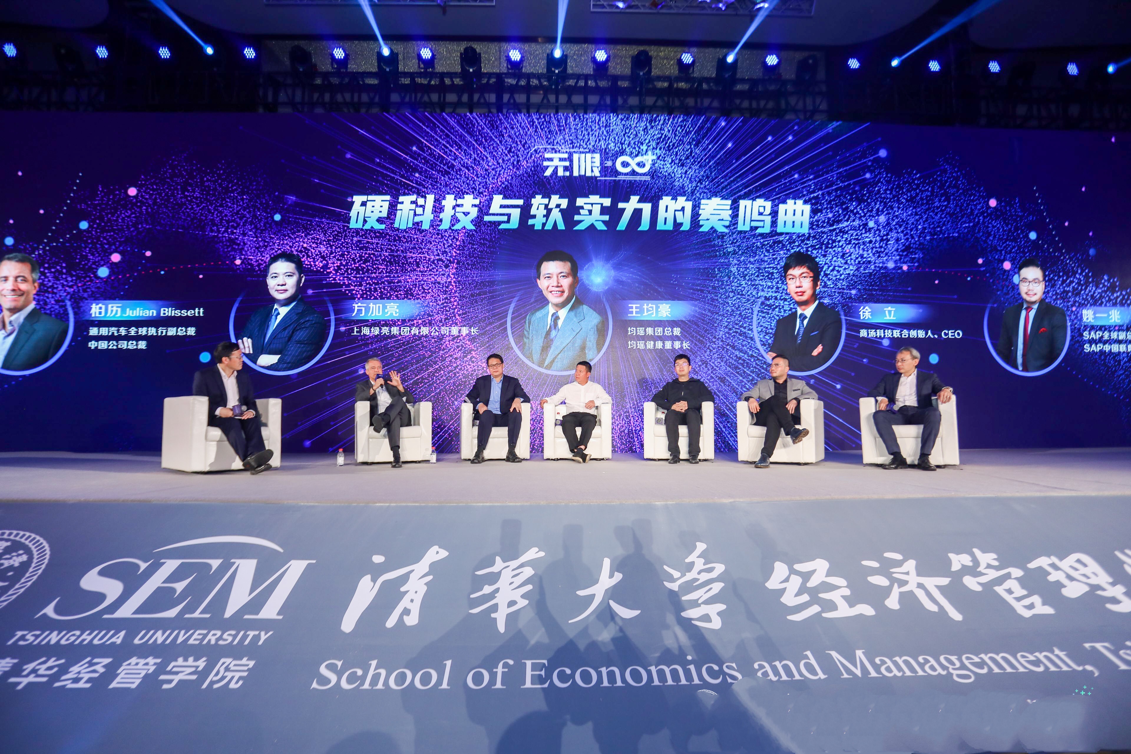 通用汽车全球执行副总裁、中国公司总裁柏历(Julian Blissett),清华经管学院高管教育中心“新时代民营企业家培养计划”发展班一期学员、上海绿亮集团有限公司董事长方加亮,清华经管学院高管教育中心“新时代民营企业家培养计划”发展班二期学员、均瑶集团总裁、均瑶健康董事长王均豪,商汤科技联合创始人、CEO徐立,SAP 全球副总裁、SAP中国联席总经理姚一兆,西门子中国执行副总裁朱骁洵在“硬实力和软实力的奏鸣曲”论坛中围绕大科技时代企业的竞争力、硬科技和软实力的碰撞和交融作了深入交流。