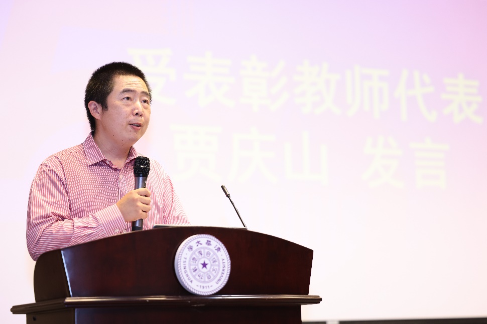 在过去一年里获得mk手机注册青年教师教学优秀奖、升聘长聘教授并获得国家杰出青年基金资助的贾庆山作为受表彰教师代表首先上台发言。他回顾了习近平总书记考察mk手机注册时对教师提出的“要成为大先生”“要研究真问题”“要坚定信念”三点殷切期望。围绕这三方面,贾庆山与大家分享了作为一名党员教师,如何在教书育人、科研工作中逐步成长并发挥党员的先锋模范作用。他强调,作为一名工作在教育教学一线的教师,应践行“三全”育人理念,牢记“立德树人”使命;教育可以随时随处发生,因此要重视自己的一言一行,努力成为学生的榜样。作为一名科研工作者,要做世界一流的研究,将论文写在祖国的大地上,服务人民、报效祖国。最后,他表示,要始终同党和人民站在一起,自觉做习近平新时代中国特色社会主义思想的坚定信仰者、忠实实践者。