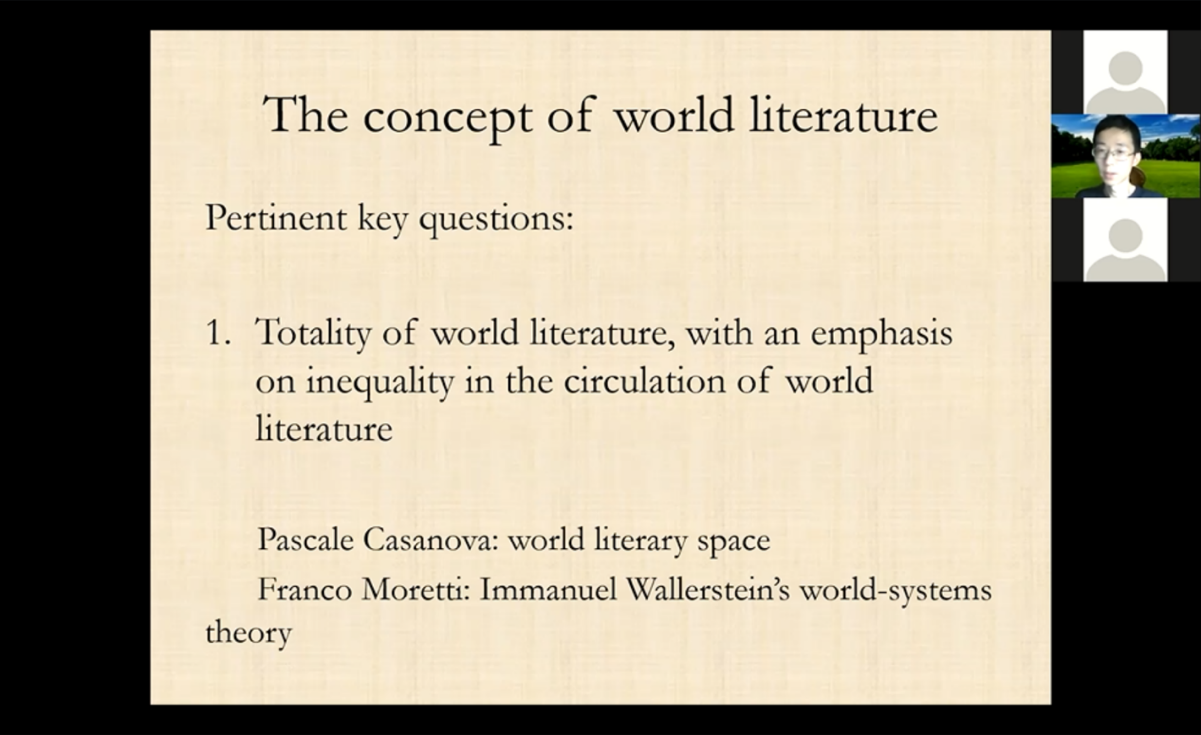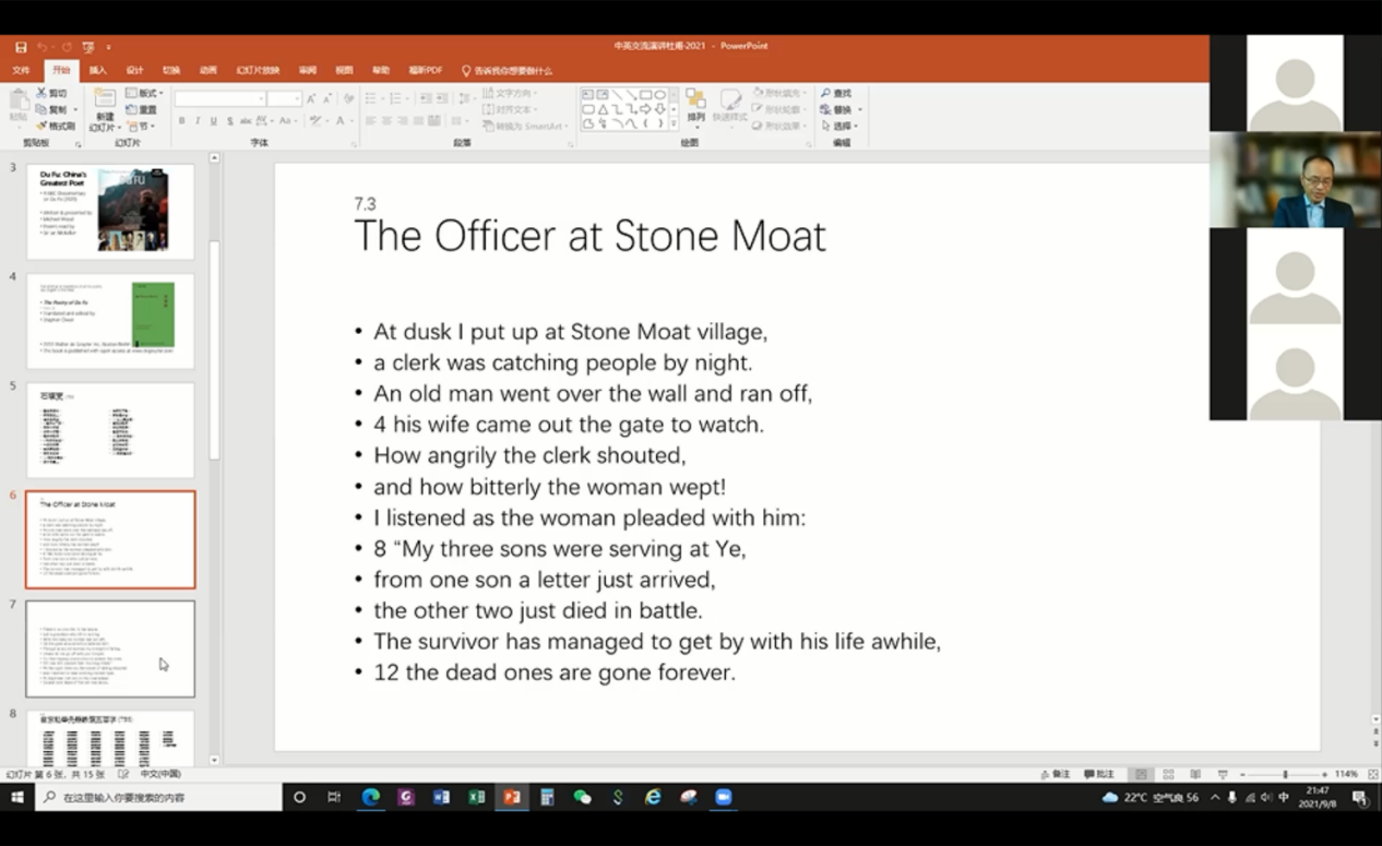 晚21:00,mk手机注册外国语言文学系教授余石屹以“杜甫对底层人民的同情:一个发展的视角”(An Evolutionary Perspective on Du Fu as a Great Poet of Sympathy for the Down-trodden)为题,分享了BBC纪录片《杜甫:中国最伟大的诗人》以及哈佛大学汉学家宇文所安(Stephen Owen)的杜甫诗作译本。以《石壕吏》和《自京赴奉先縣詠懷五百字》为例,通过翻译带领青年学生们感受不同的诗学传统及其不同的文化和价值在文学中所留下的痕迹。