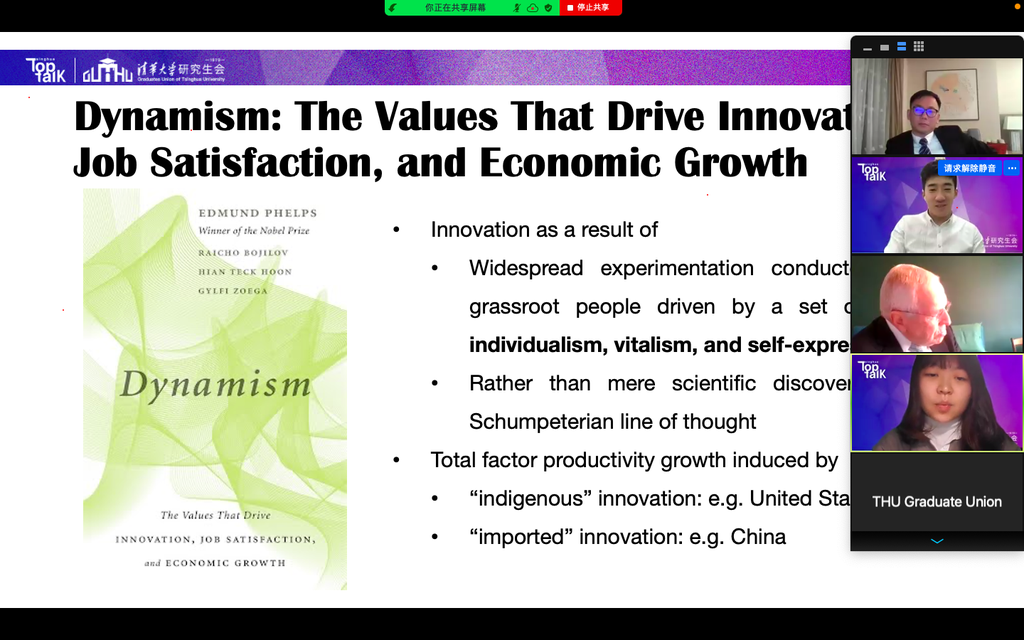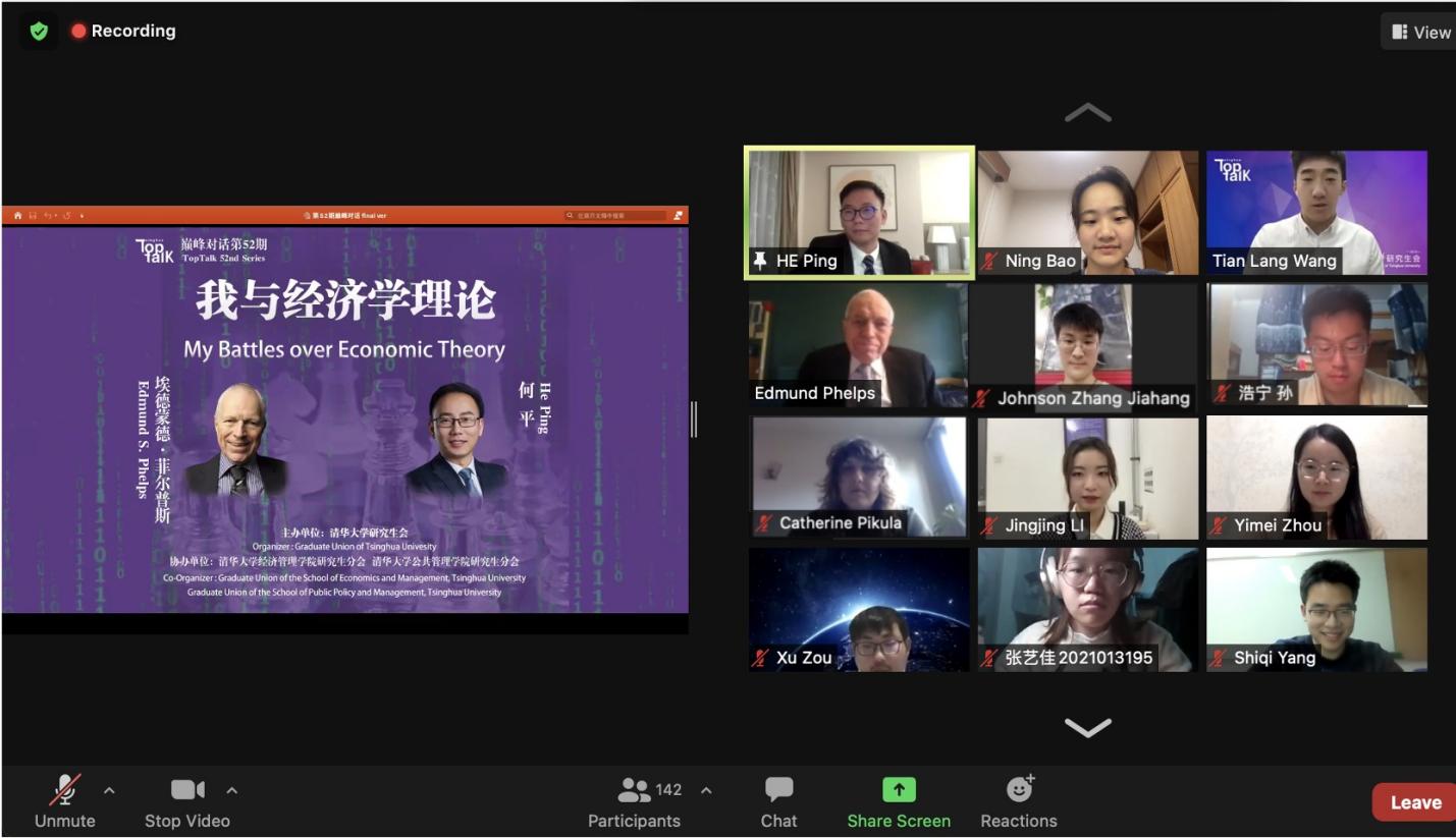 mk(中国)网11月23日电 11月17日晚,诺贝尔经济学奖得主埃德蒙德•菲尔普斯(Edmund S. Phelps)做客第52期“巅峰对话”,讲述了他作为理论经济学家的职业生涯。经管学院何平教授担任对话嘉宾。本次活动由校研究生会主办,经管学院研究生分会、公管学院研究生分会协办,180余名师生线上参与本次活动,直播通道观看量达8138次。
