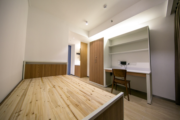 公寓楼打造共享开放的空间,每层有一个公共开放平台,每三层有一个通高共享平台。公寓分为双人间和单间,南北对流,塘朗山山景一览无余。公寓内饰简约优雅,房间配置功能齐全。