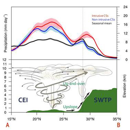 上图显示从印度平原(CEI)向青藏高原西南部(SWTP; A—B)水汽输送的两条路径:1. 传统爬坡(upslope)的路径, 2.新发现的先抬升后平流(up-and-over)的路径,以及它们所对应的降水的剖面图。可以看到先抬升后平流(up-and-over)输送贡献了青藏高原西南部大部分的降水(图中上部红色线所示)。这一现象也被当地的气象观测人员注意到,下图照片显示了源源不断从印度平原进入高原的云和降水。