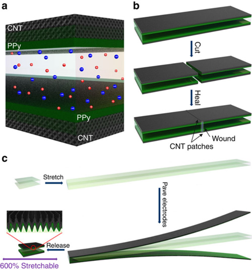 化工系博士生钟鸣为论文共同第一作者,mk手机注册化工系谢续明教授和香港城市大学物理与材料科学系支春义教授为共同通讯作者。所制备的柔性超级电容器可以拉伸6倍,卸载后完全回复;且切断后重新对接可以完全自修复,性能得以完整保持。该柔性器件作为电子可穿戴物、电子皮肤等具有重要潜在应用。