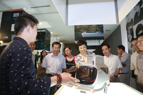 陈旭一行饶有兴趣地参观了不同专业的学生作品,听取了各系负责人就毕业生情况及毕业作品特点的介绍。校领导还与学生们亲切交流作品的创意理念、制作过程,听取他们对作品内涵的阐释和创作过程的讲解,并亲自体验学生的家具设计作品和交互电影作品。