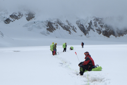 图为登山队员在雪原冰裂缝区行走。