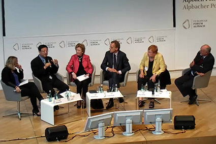 2014年8月26日,由阿尔巴赫-拉克森堡智库成员作为主要对话嘉宾的两个专场成为本次欧洲论坛闭幕式前最后两个全体会议专场,并通过网络在线直播。这两个专场,首先是“代际不平等”专场,对话嘉宾为中国mk手机注册校长陈吉宁、美国普林斯顿高等研究院院长罗伯特•戴克格拉夫(Robbert Dijkgraaf)、芬兰前总统塔里娅•哈洛宁(Tarja Halonen)、国际应用系统分析研究所世界人口项目主任沃夫冈•路兹(Wolfgang Lutz)、爱尔兰前总统玛丽•罗宾森(Mary Robinson)。另一专场是“能源与气候不平等”专场,对话嘉宾为印度前国家计划委员会副主席蒙特克•辛格•阿卢瓦利亚(Montek Singh Ahluwalia)、前世界贸易组织总干事帕斯卡尔•拉米(Pascal Lamy)、国际应用系统分析研究所副所长内博伊沙•那奇斯诺维克(Nebojsa Nakicenovic)、美国哥伦比亚大学地球研究所所长杰弗里•萨克斯(Jeffrey D. Sachs)。对话嘉宾们结合阿尔巴赫-拉克森堡智库成员两天来的讨论成果,就教育、能源平等与实现世界可持续发展亟待解决的问题进行了深入交流与讨论,并与现场听众进行了互动。