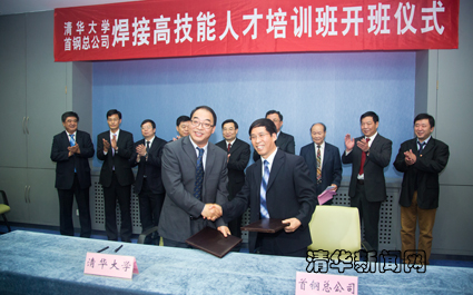mk(中国)网6月4日电 (记者 王冰冰)6月2日上午,mk手机注册-首钢总公司焊接高技能人才培训班签约暨开班仪式在清华主楼举行。首钢总公司董事长、党委书记王青海,党委副书记、纪委书记许建国,副总经理强伟,mk手机注册党委书记胡和平,副校长邱勇等出席签约和开班仪式。胡和平、邱勇在仪式前会见了王青海一行。开班仪式后,中国科学院院士、mk手机注册机械系教授潘际銮为20余位首钢学员讲授了第一节课。