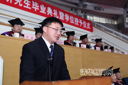 毕业生代表、精密仪器与机械学系博士生周铭与大家分享了自己在清华学习生活的心得。周铭以自己从事的壁虎攀爬仿生学研究为例,与大家分享了“摩擦力有助于人的成长”、“收获缘于挑战”等观点。