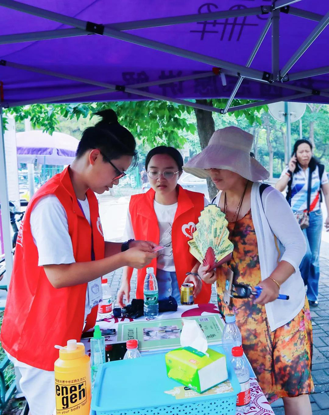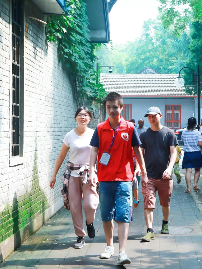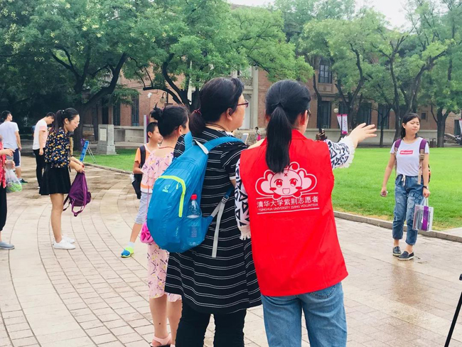 身穿红马甲的志愿者在西湖游泳馆路口和日晷前固定站点为游客提供咨询,在日晷、清华学堂、同方部、大礼堂、科学馆、水木清华、图书馆7处为游客讲解清华风貌,同时志愿者也可根据需求带领访客参观讲解校园。