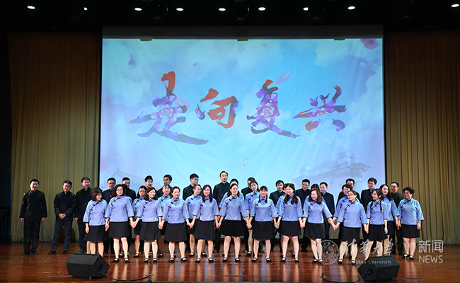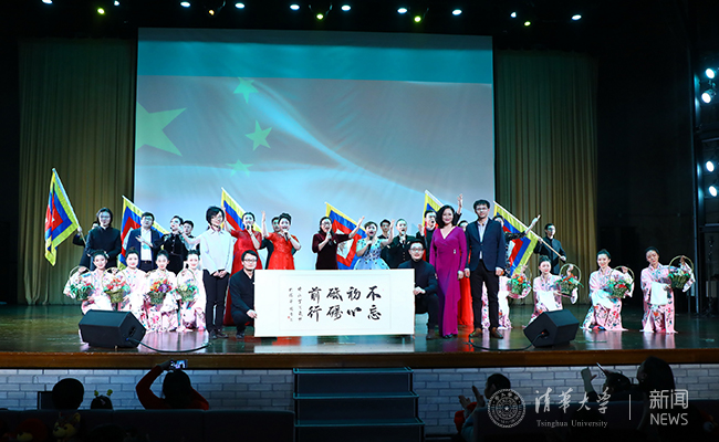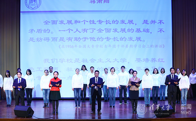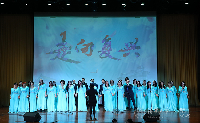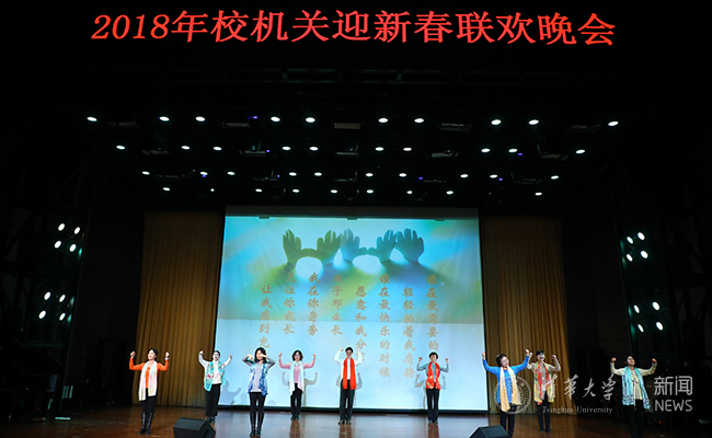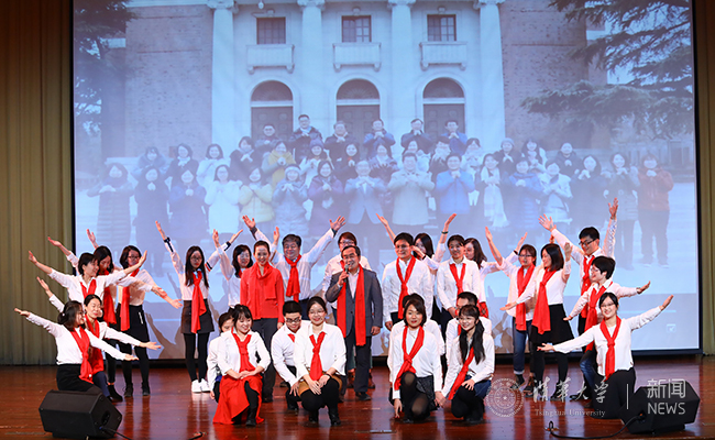 校机关新入职青年教职工表演唱《新时代,双一流—清华师生大步走》。