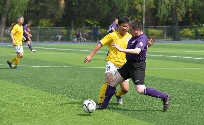 足球联谊赛由身穿紫色队服的“81联队”对身穿黄色队服的“81热汽”队。“81联队”由各系代表联合组成,“81热汽”队由热能系和汽车系校友组成。20余名队员当年曾在西操挥洒汗水、纵横球场,如今已两鬓染霜,年龄相加过千岁,所以戏称为“千岁球赛”。
