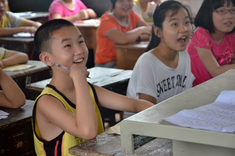 贫困县孩子们向清华的扶贫教师绽放开心笑容。
