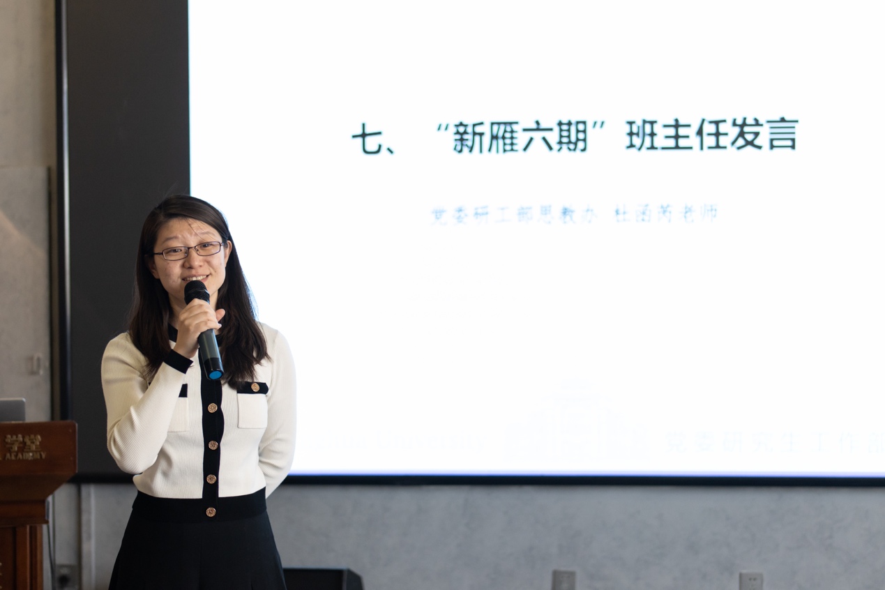 “新雁六期”班主任、研工部思教办主任杜函芮表示,希望同学们有效利用“新雁班”提供的学习资源和平台,加强院系交流,练就过硬本领,助力研究生党建工作高质量发展。