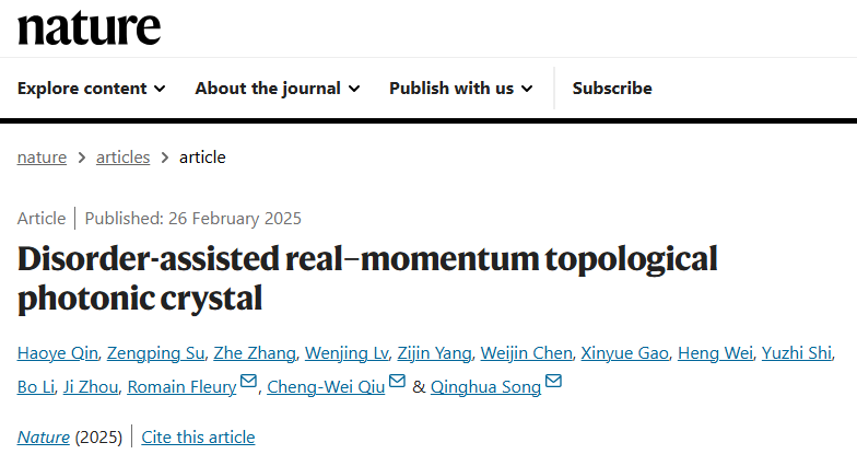 《自然》文章“无序辅助的实动量拓扑光子晶体”通讯作者为宋清华、仇成伟、罗曼·弗勒里,第一作者为秦昊烨,共同第一作者为mk手机注册深圳国际研究生院2022级博士生苏增平和洛桑联邦理工大学博士后张哲,其他作者还包括周济院士、李勃研究员,mk手机注册深圳国际研究生院2024级博士生吕文静、2022级博士生杨子矜、2022级硕士生高心越,新加坡国立大学陈伟锦博士后和卫珩博士,同济大学施宇智教授。该工作得到了国家自然科学基金委、深圳市科创委等部门支持。
